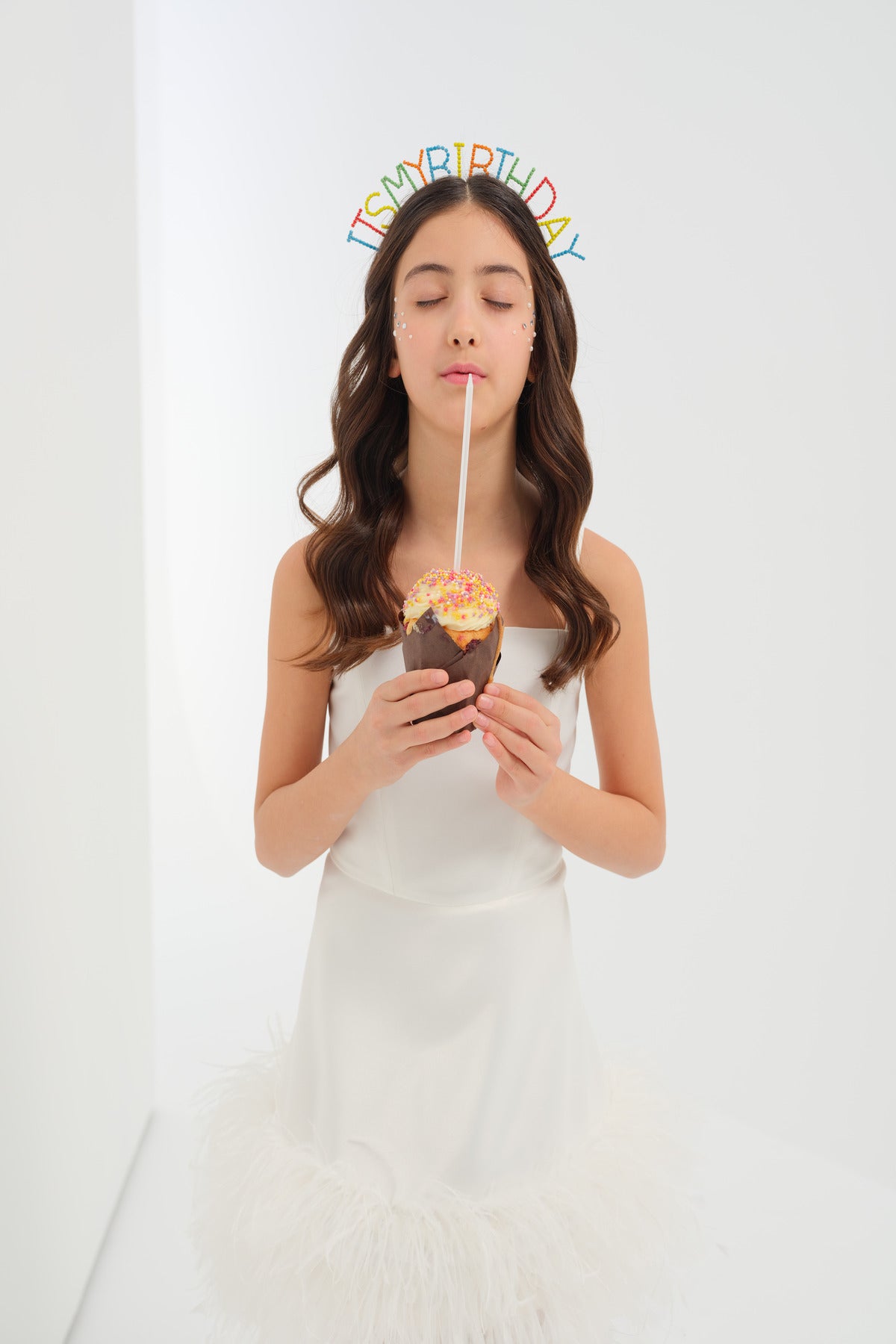 BEYAZ KISA ETEK UCU TÜYLÜ BEDENE OTURAN ELBİSE