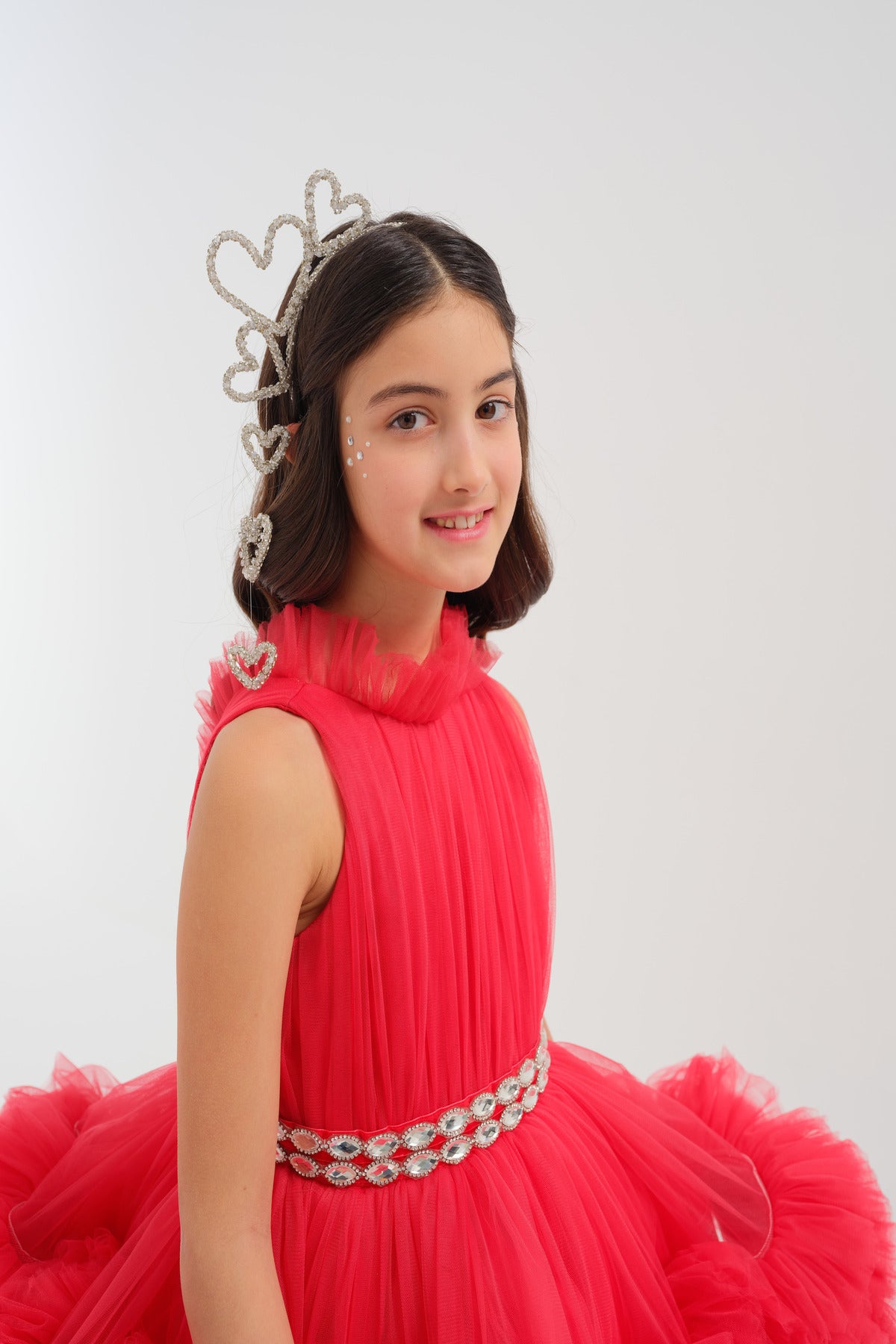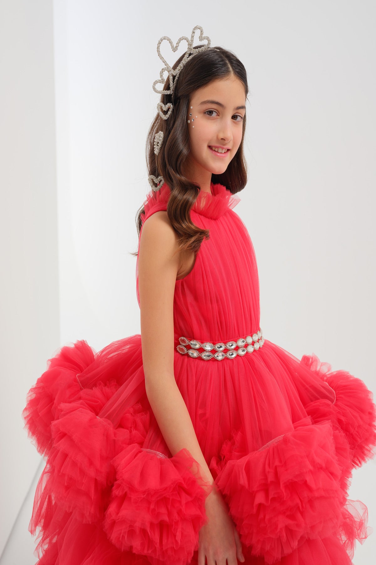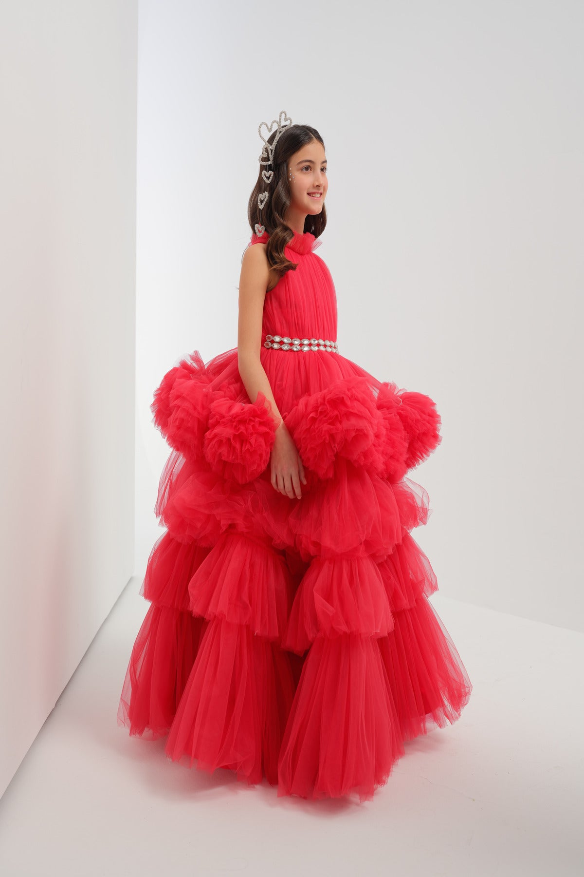 KIRMIZI GRENLİ DRAPE VE TAŞ İŞLEM DETAYLI KAT KAT UZUN KABARIK ELBİSE