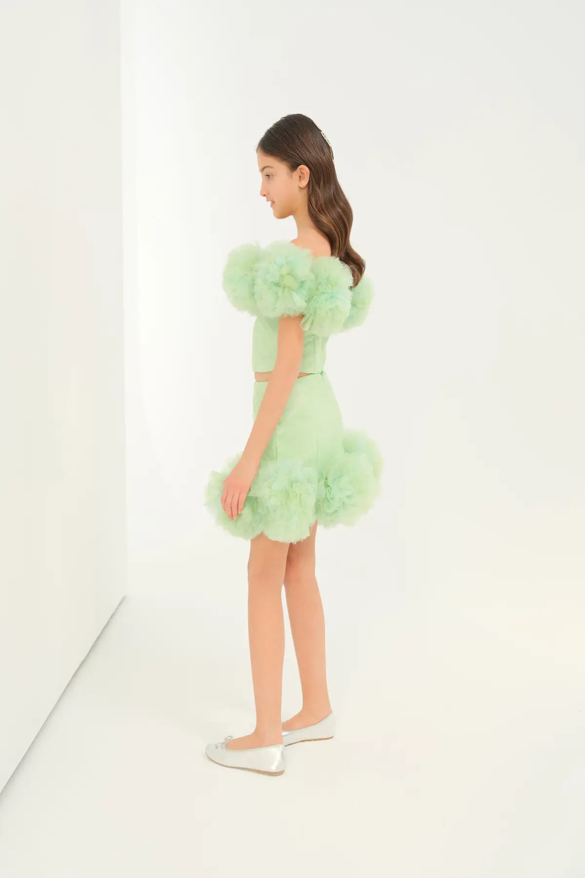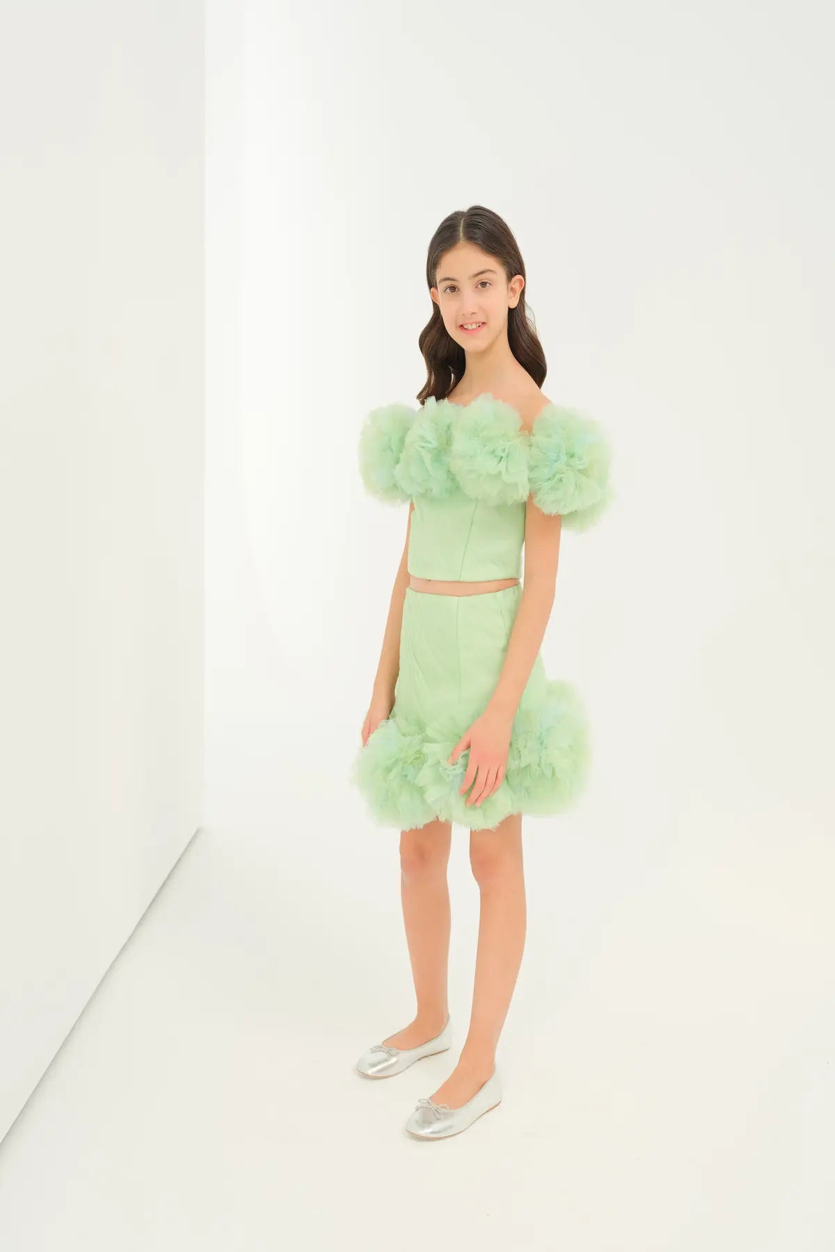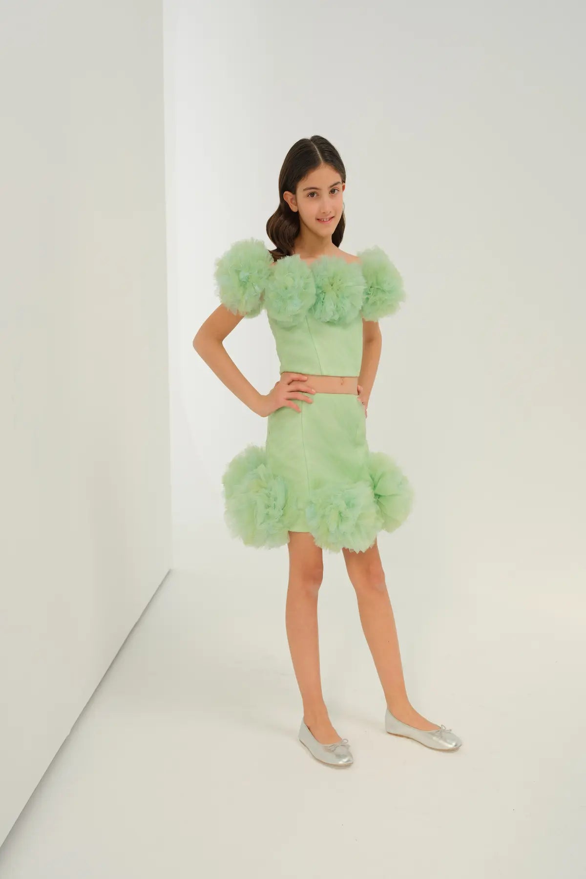 DRAPELİ PONPON DETAYLI ETEK CROP TAKIM