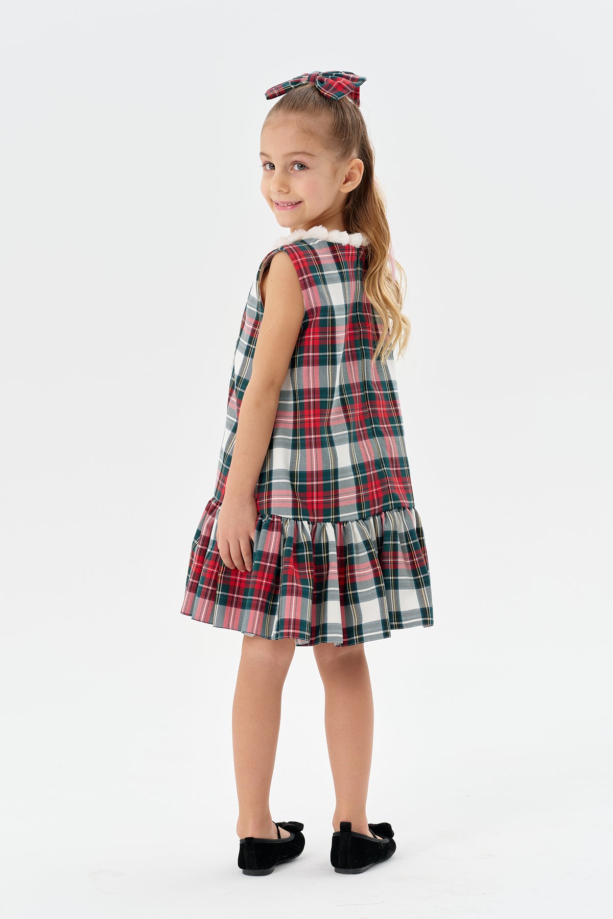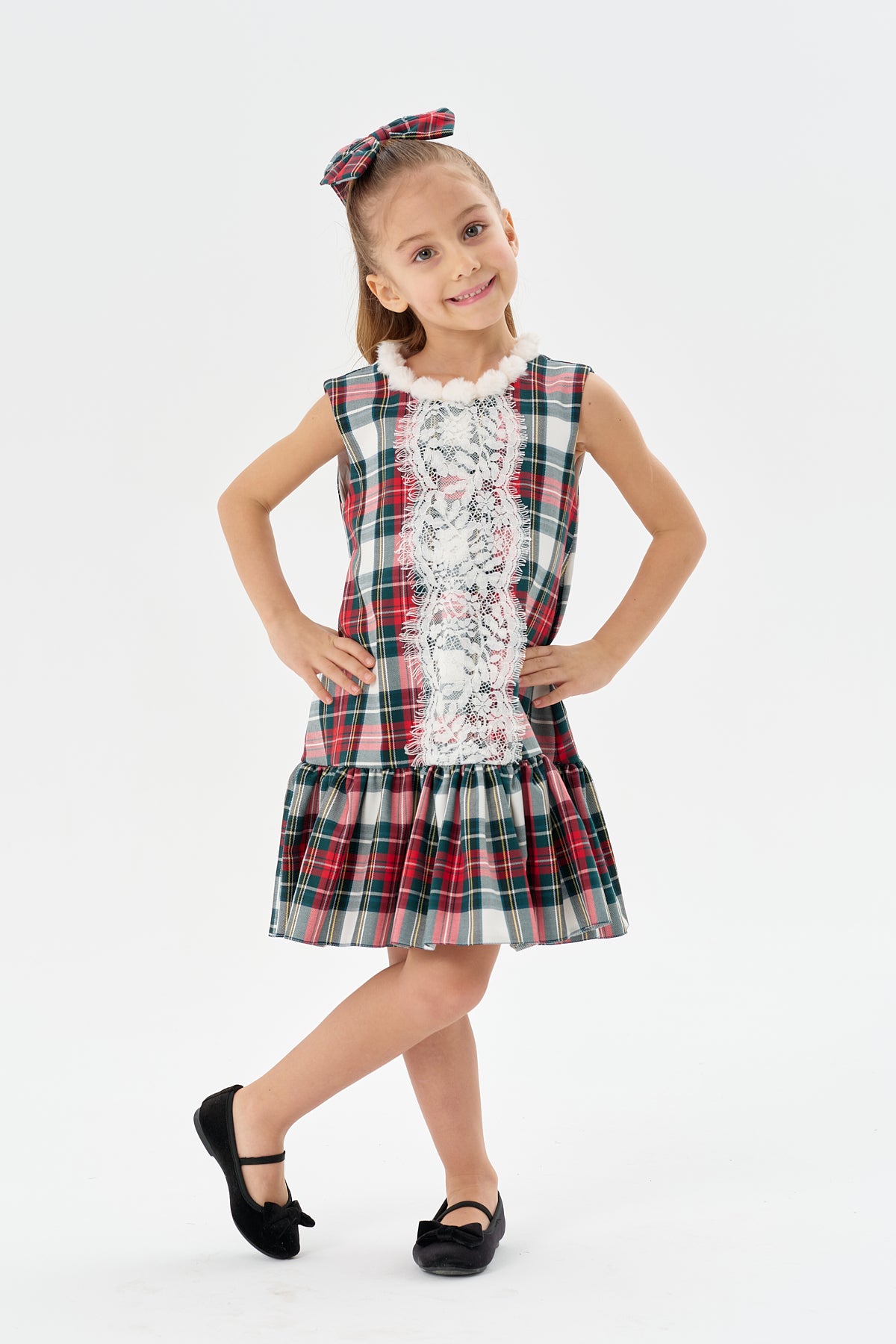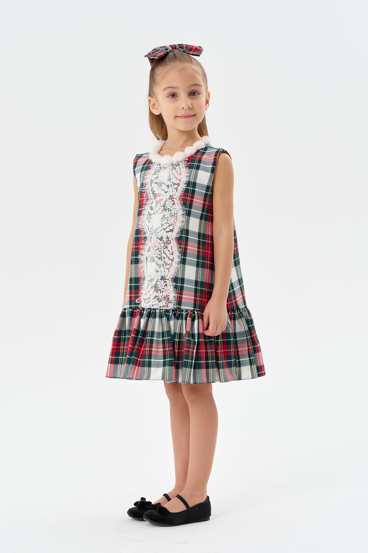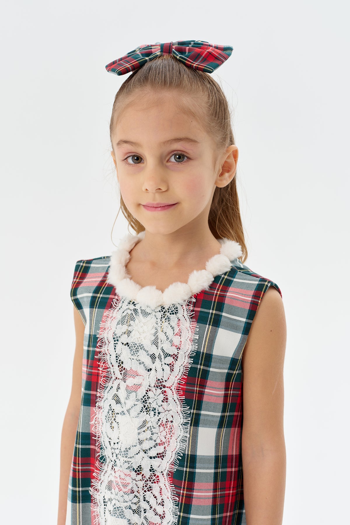 yeşil kareli dokuma kumaş,beyaz dantel detaylı yakası ponponlu,etk ucu fırfırlı jile elbise
